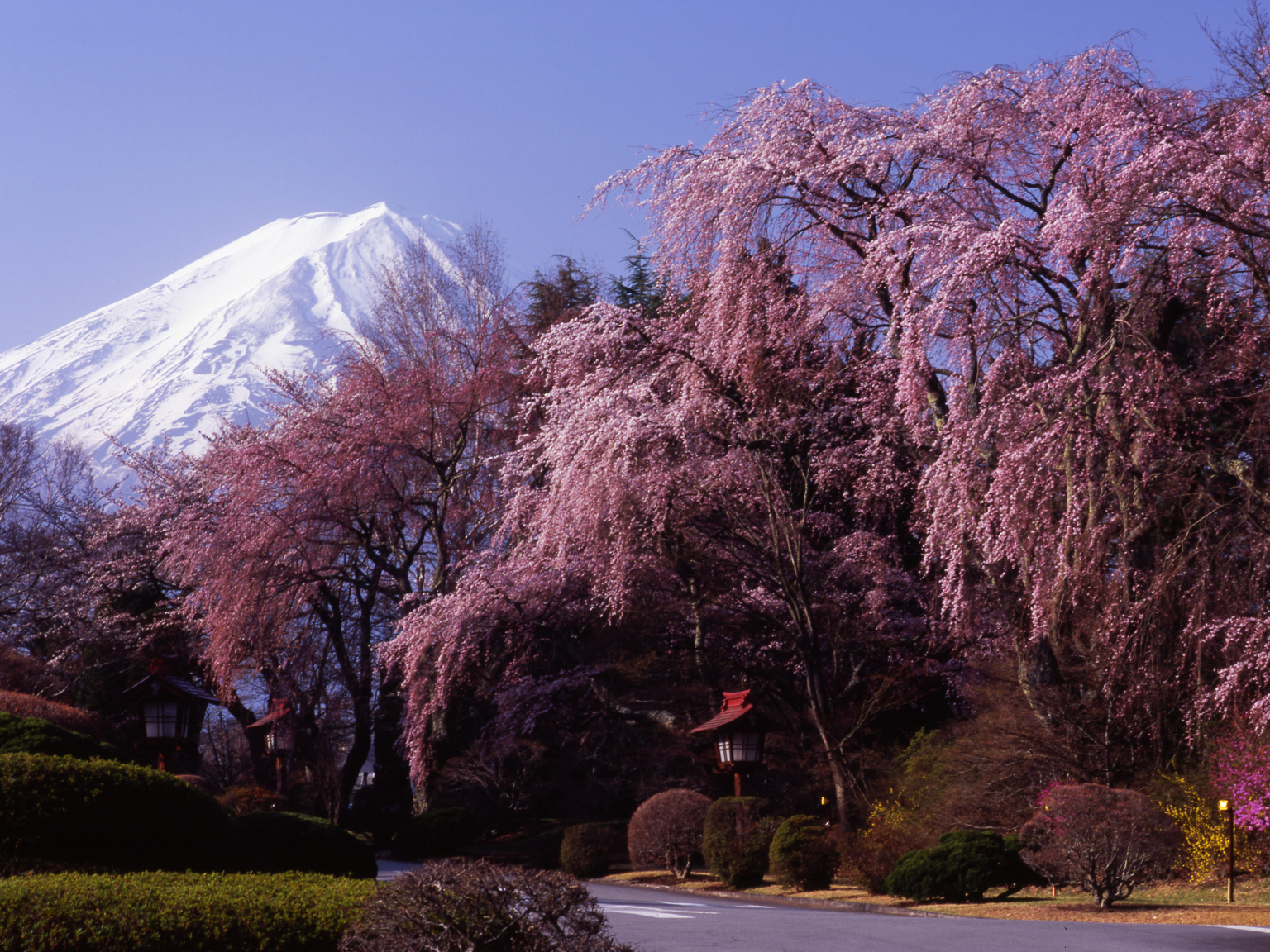 中でも、枝が地面に向かって垂れ下がった姿が優雅で、頭上から沢山の桜の花が降ってくるかのような「しだれ桜」と、富士山の景色は大人気!