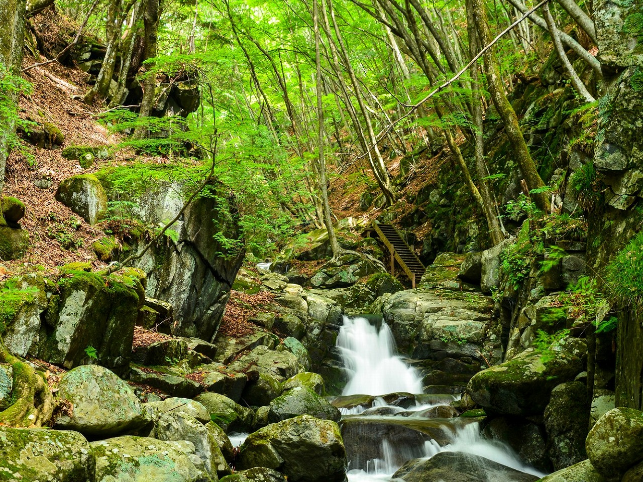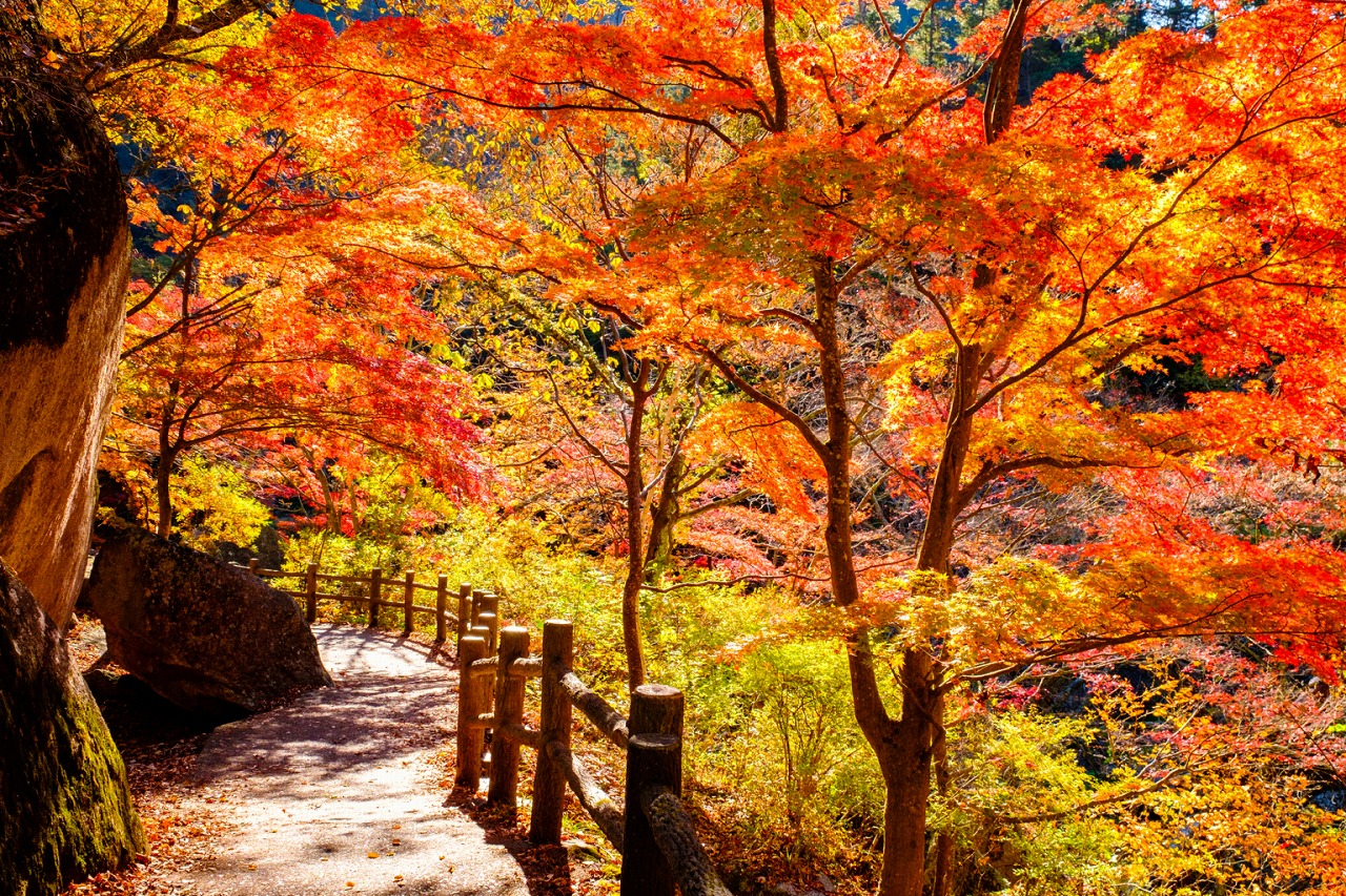 深い原生林と澄んだ清流がつくり出す自然美にあふれた紅葉の名所。渓谷沿いのモミジが色づき、見事な風景が広がります。