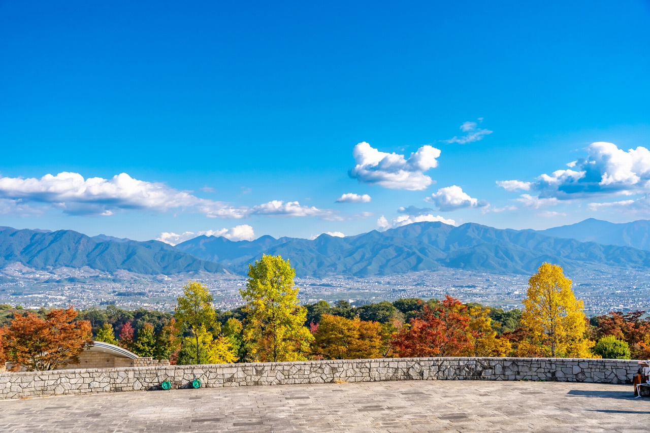 紅葉で色づいたぶどう畑が一面に広がる絶景観光地です。特に「勝沼ぶどうの丘」では、地元産ワインの試飲や温泉が楽しめ、自然の美しさと癒しの時間を満喫できます。