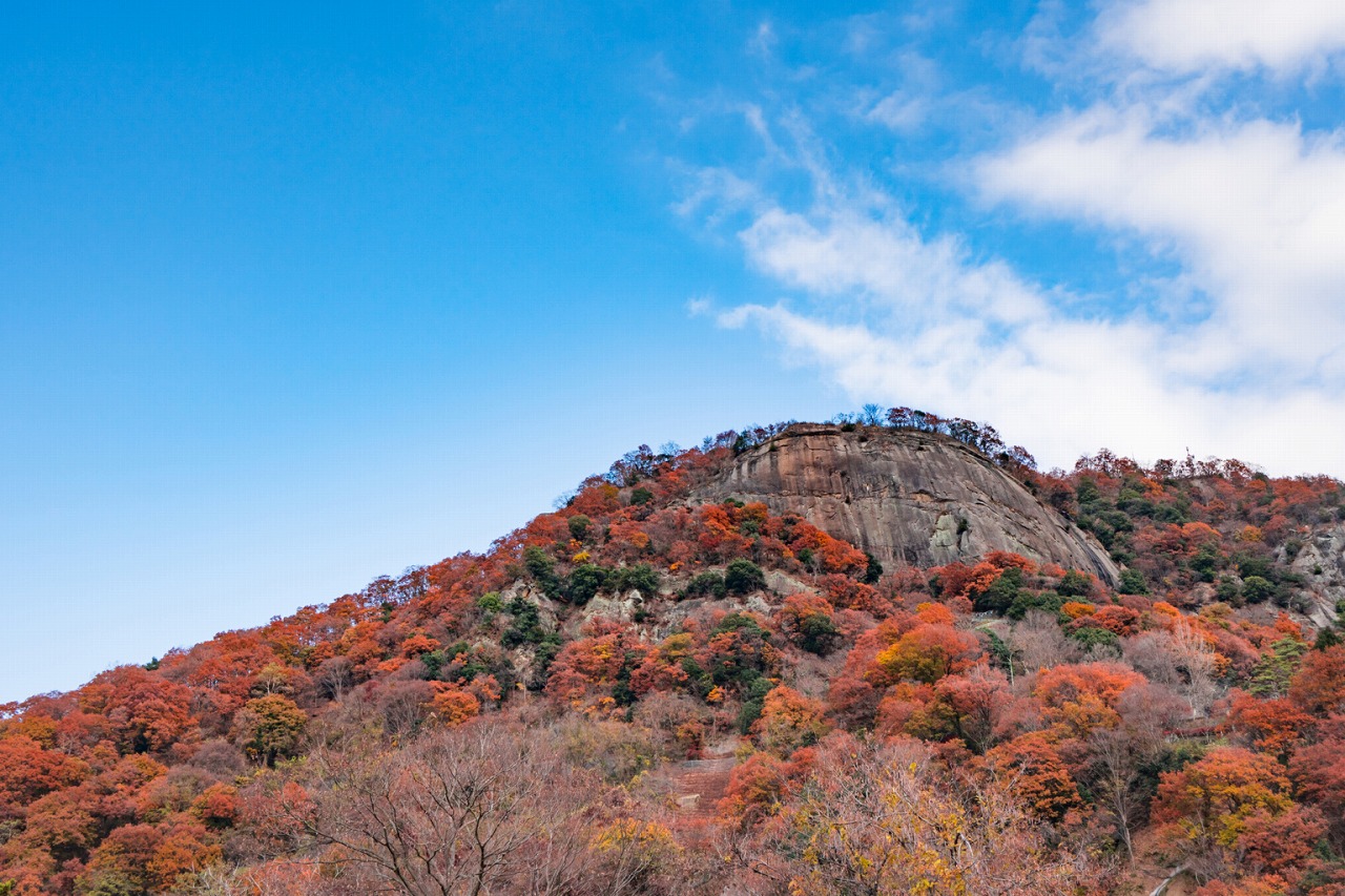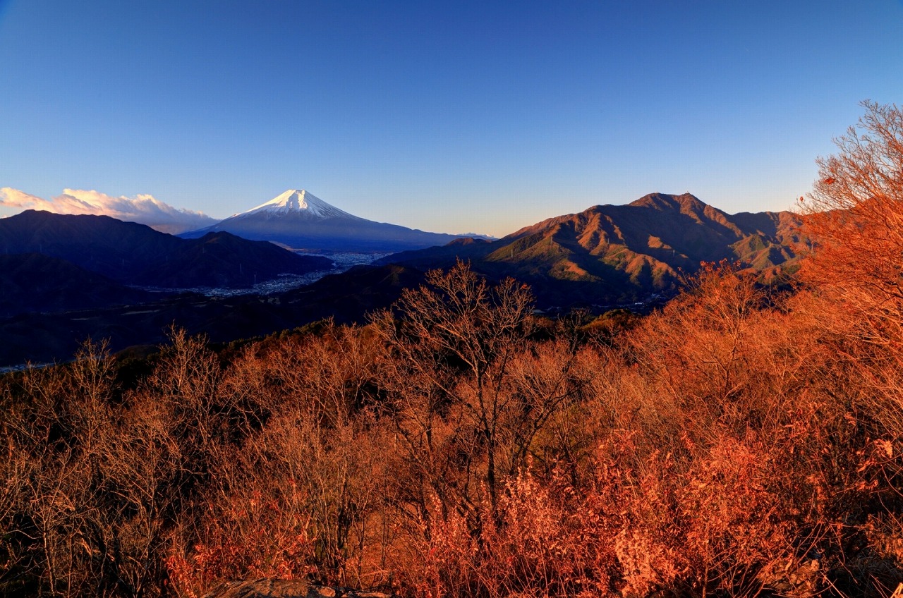 東京スカイツリーと同じ標高634mを誇る自然豊かな山で、秋には中腹の岩殿山丸山公園でイチョウや真っ赤なモミジが美しく色づきます。富士山との絶景コラボレーションが楽しめるため、紅葉シーズンには多くの観光客が訪れます。