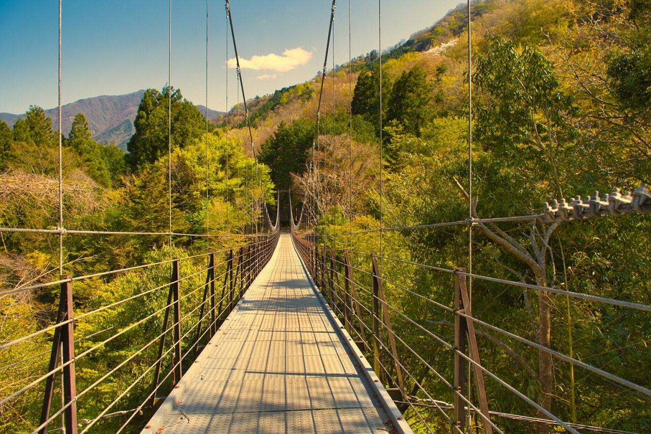 全長71m、高さ34mを誇るスリル満点の吊り橋!紅葉シーズンには、色鮮やかな山々と清流・道志川の風景が橋の上から一望でき、秋の絶景スポットとして多くの人に親しまれています。