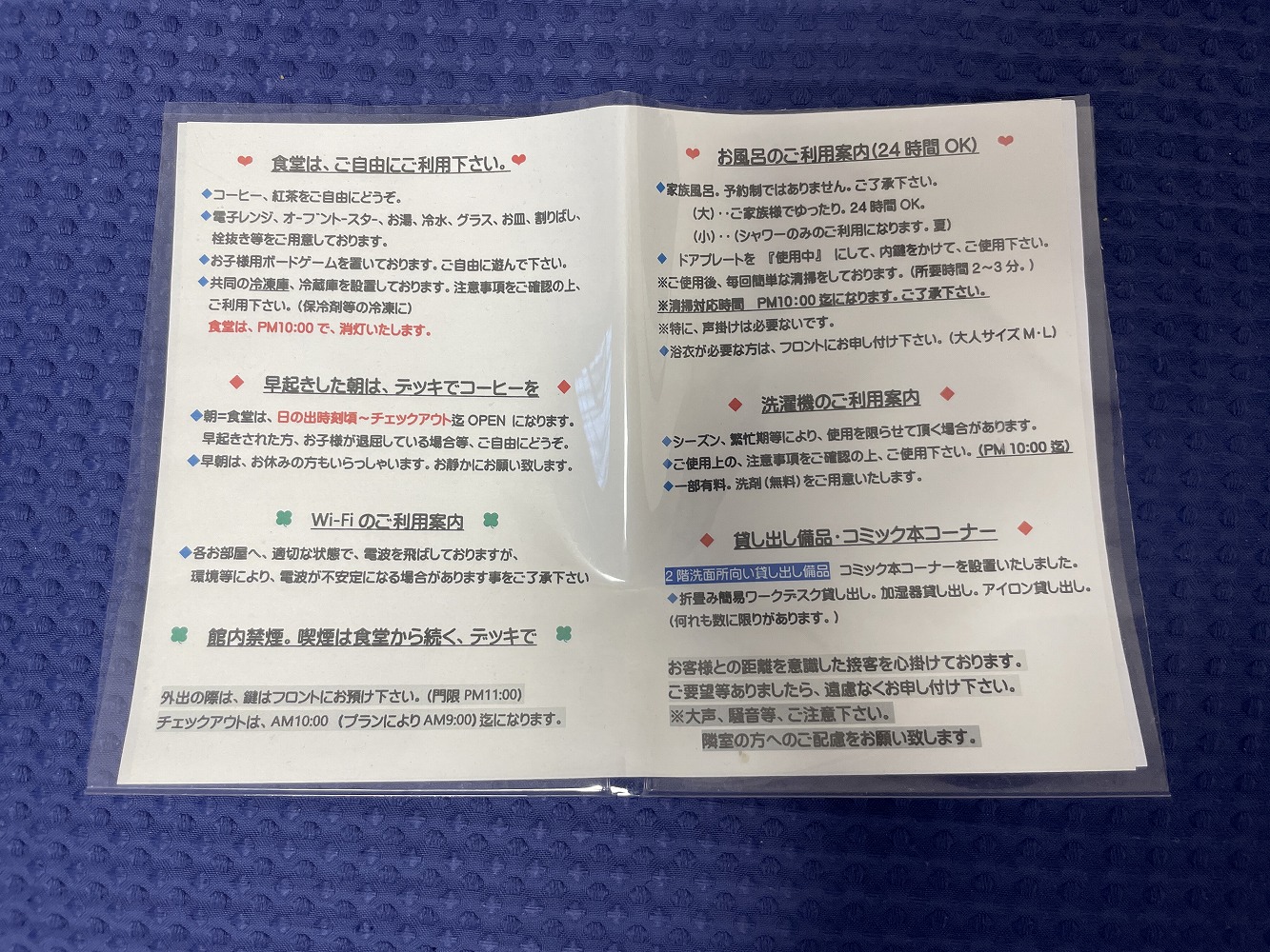 チェックインは15:00から22:00までと幅広く、チェックアウトは10:00。