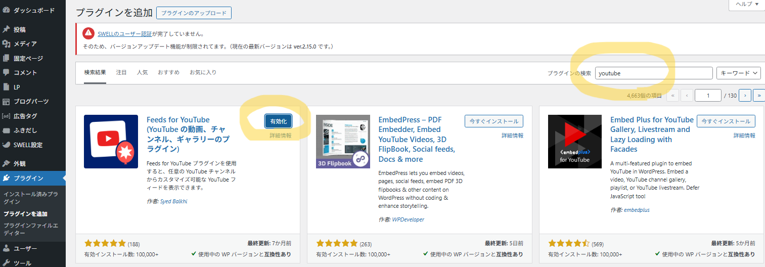 検索窓に「Feeds for YouTube」と入力し、表示されたプラグインを「今すぐインストール → 有効化」する。