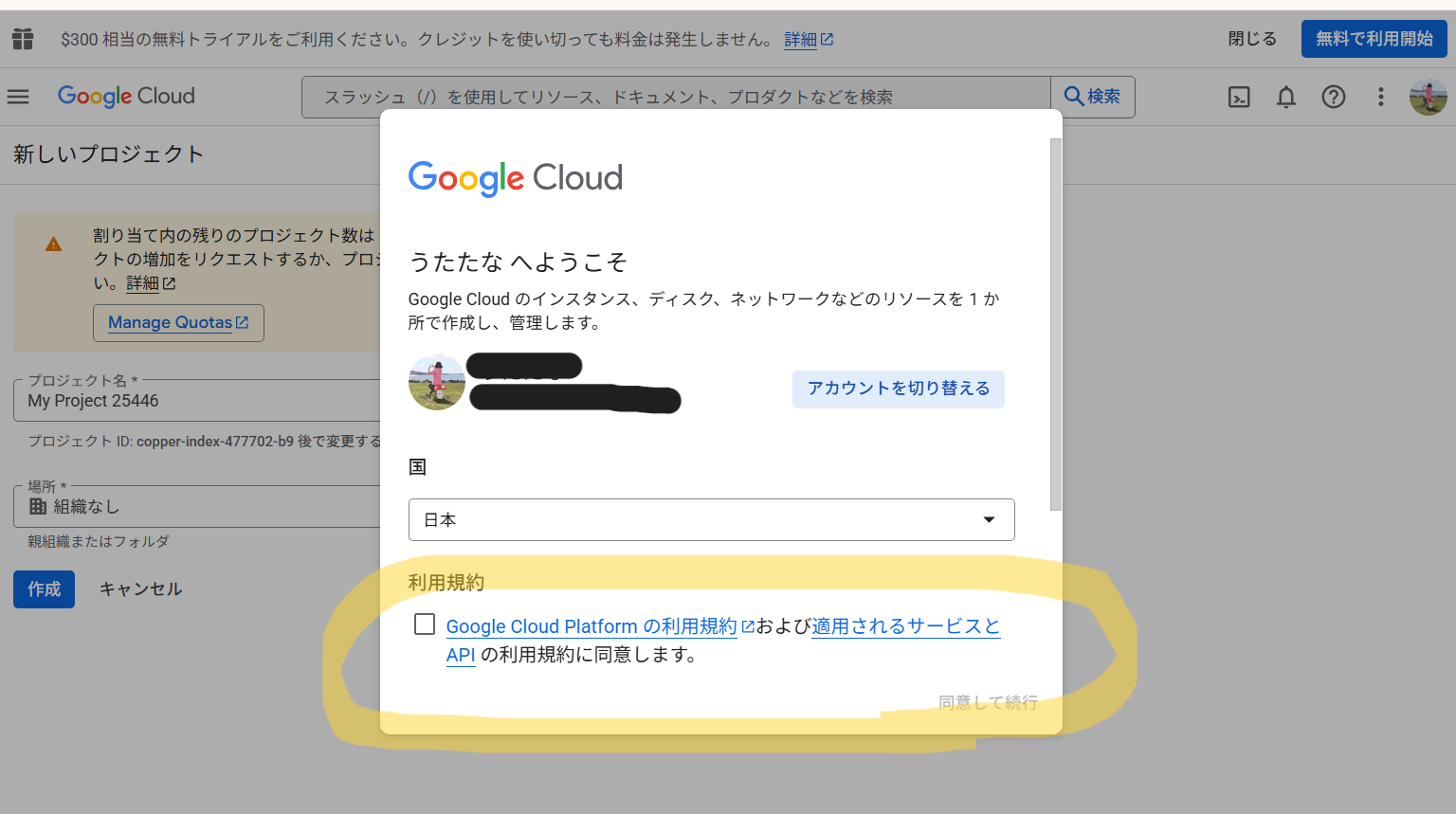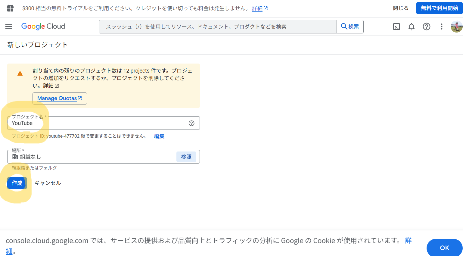 Google Cloud Platform → ログイン(Googleアカウント必須)→「新しいプロジェクト」 → 任意のプロジェクト名を入力 → 「作成」 → 数秒待ってプロジェクトが作成される