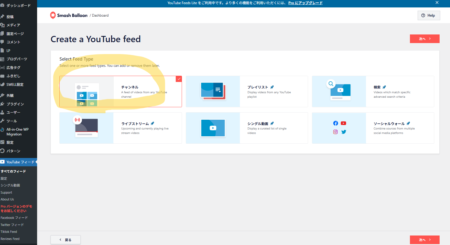 WordPress管理画面 → Feeds for YouTube → すべてのフィード → 新規追加 → 「チャンネル」を選択 → 次へ → チャンネル名を入力 → 次へ → デザイン設定(列数・サムネイルサイズなど) → 保存