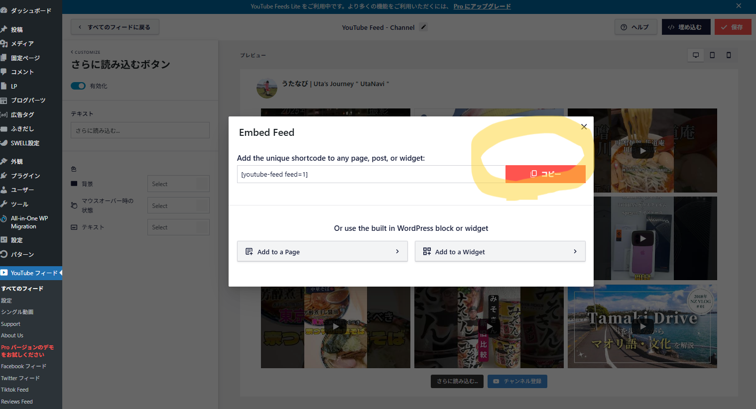Feeds for YouTube → 作成済みフィードの右上「埋め込む(Embed)」 → ショートコードをコピー → WordPress投稿画面または固定ページ本文に貼り付け → プレビューで確認 → 完成!
