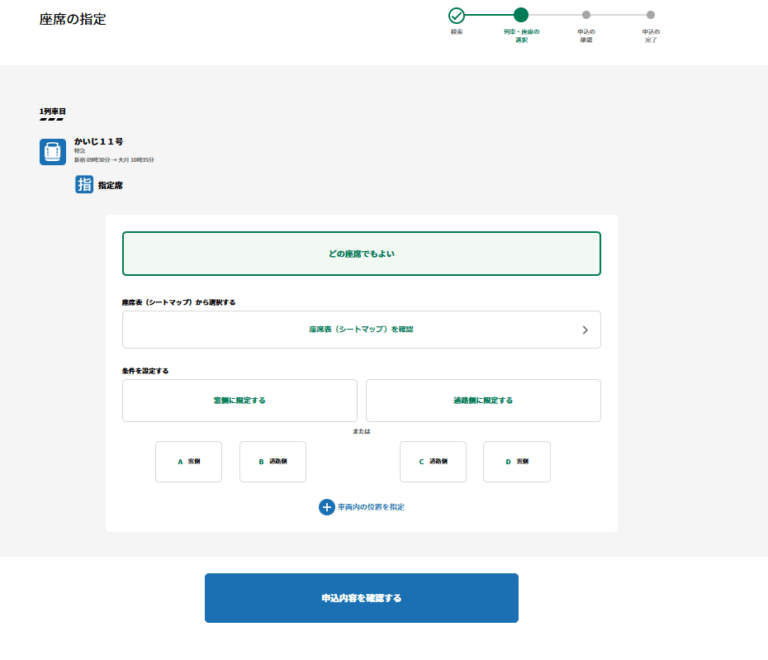 次に、座席の選択です。座席表(シートマップ)などから選択も可能です。