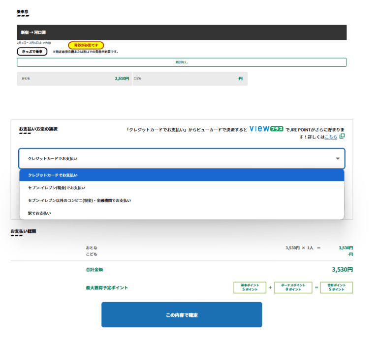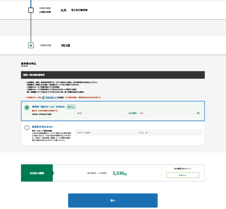 「乗車券(紙のきっぷ)を申込む(割引なし)」or「乗車券を申込まない」にチェックを入れます。