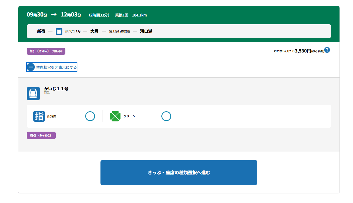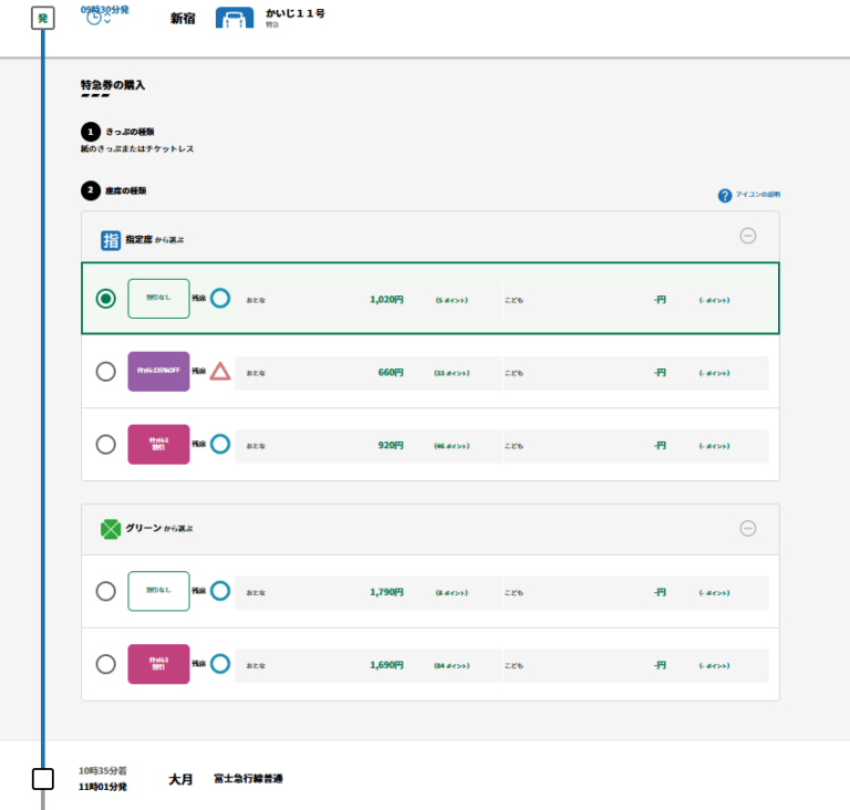 「指定席から選ぶ」にて「割引なし」or「チケットレス割引」を選択します。