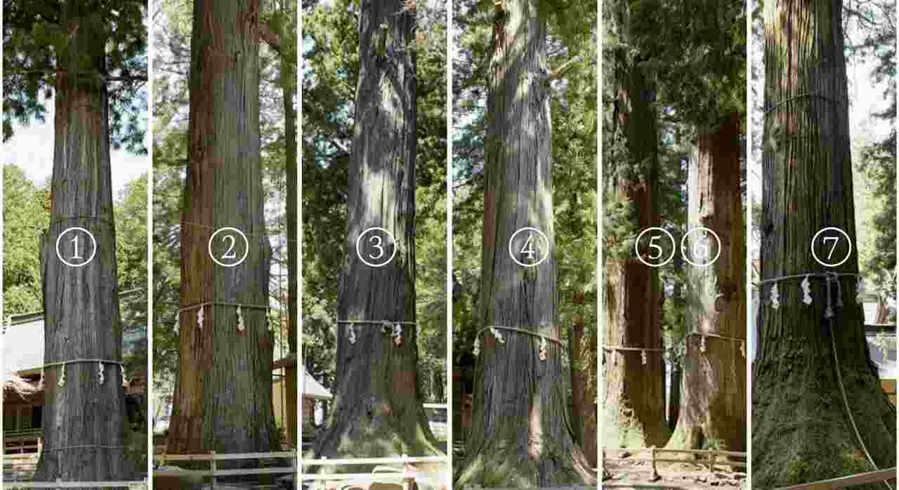 いずれも樹齢1200年の七本杉は、見どころの一つです。反時計周りで1〜7まで数字と名前が付けられており、いずれも樹高は約40m。どの杉も幹がまっすぐ伸びており、枝分かれしているものがないのが特徴です。