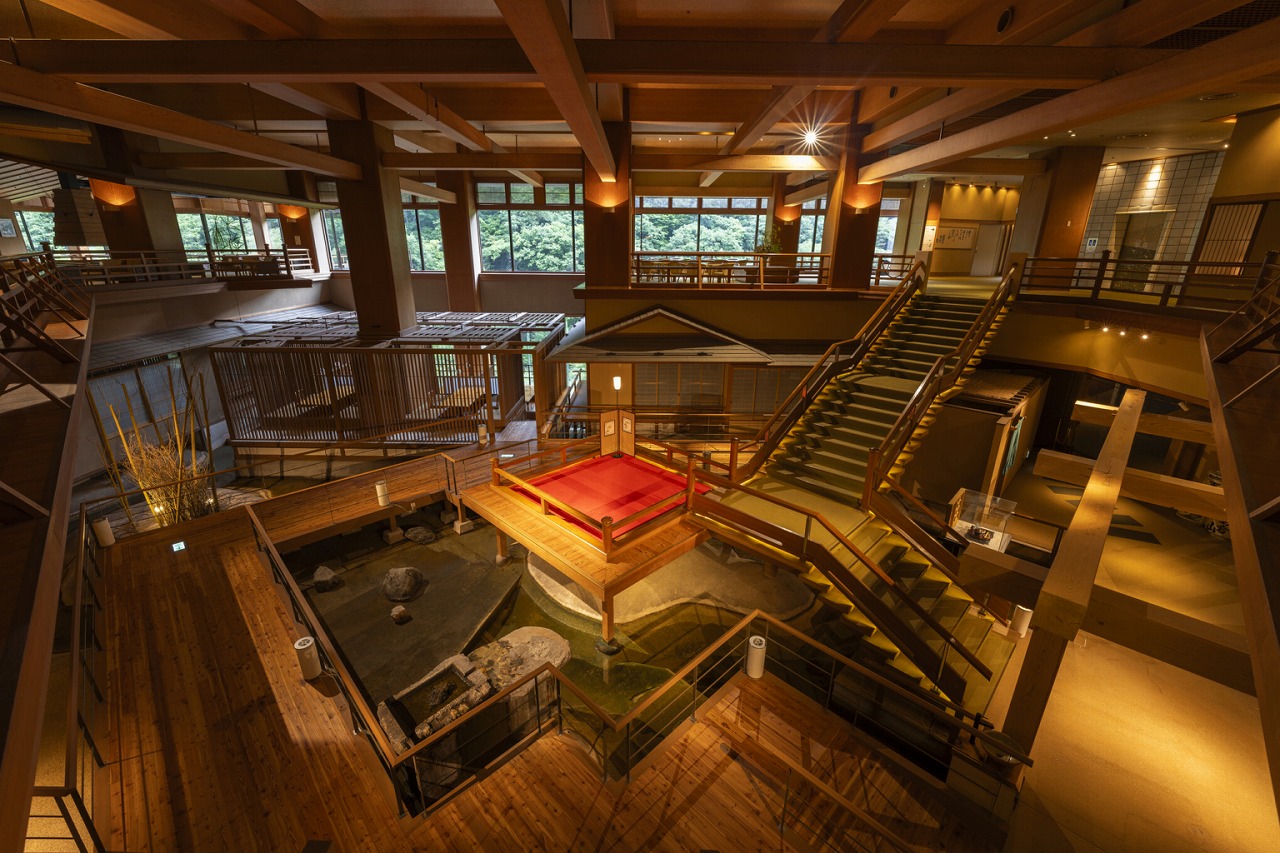 大川荘の魅力のひとつは、その豪華な吹き抜けのロビー!中央には浮き舞台が設置され、定期的に三味線の演奏が行われます。その音色は、鬼舞辻無惨の側近で無限城を操る「鳴女」が奏でる琵琶の音色のようです。