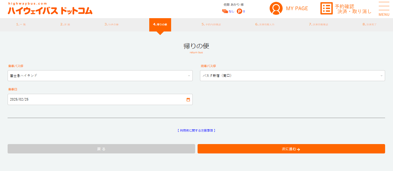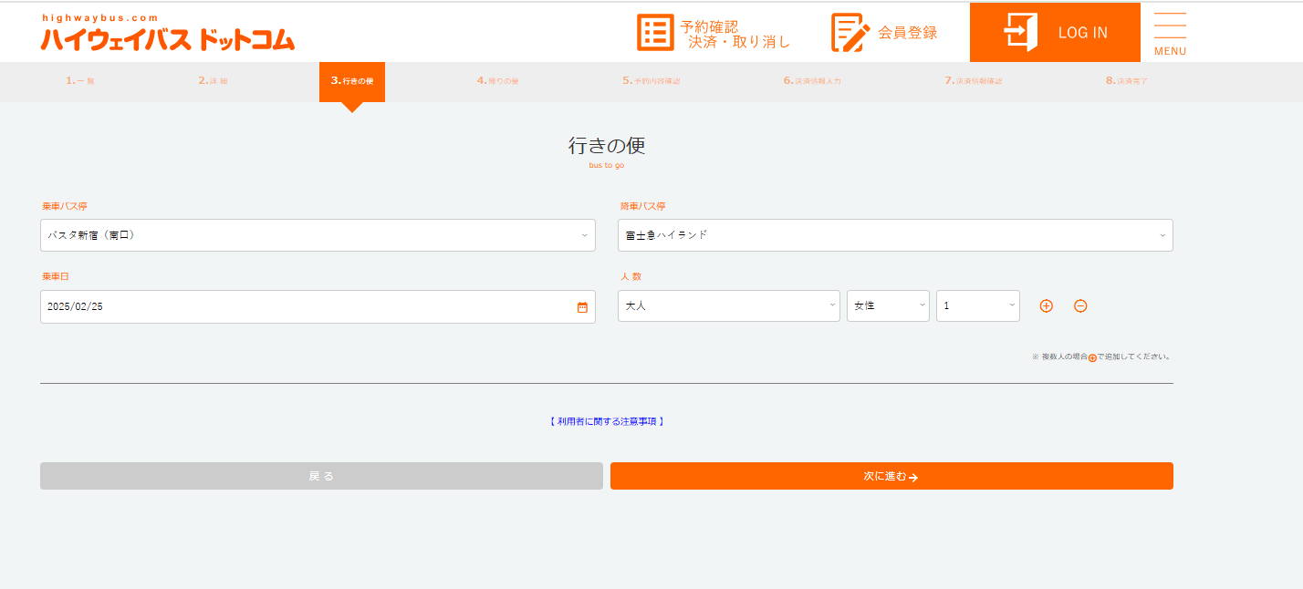 日付・人数を入力し、行きのバスを選びます。