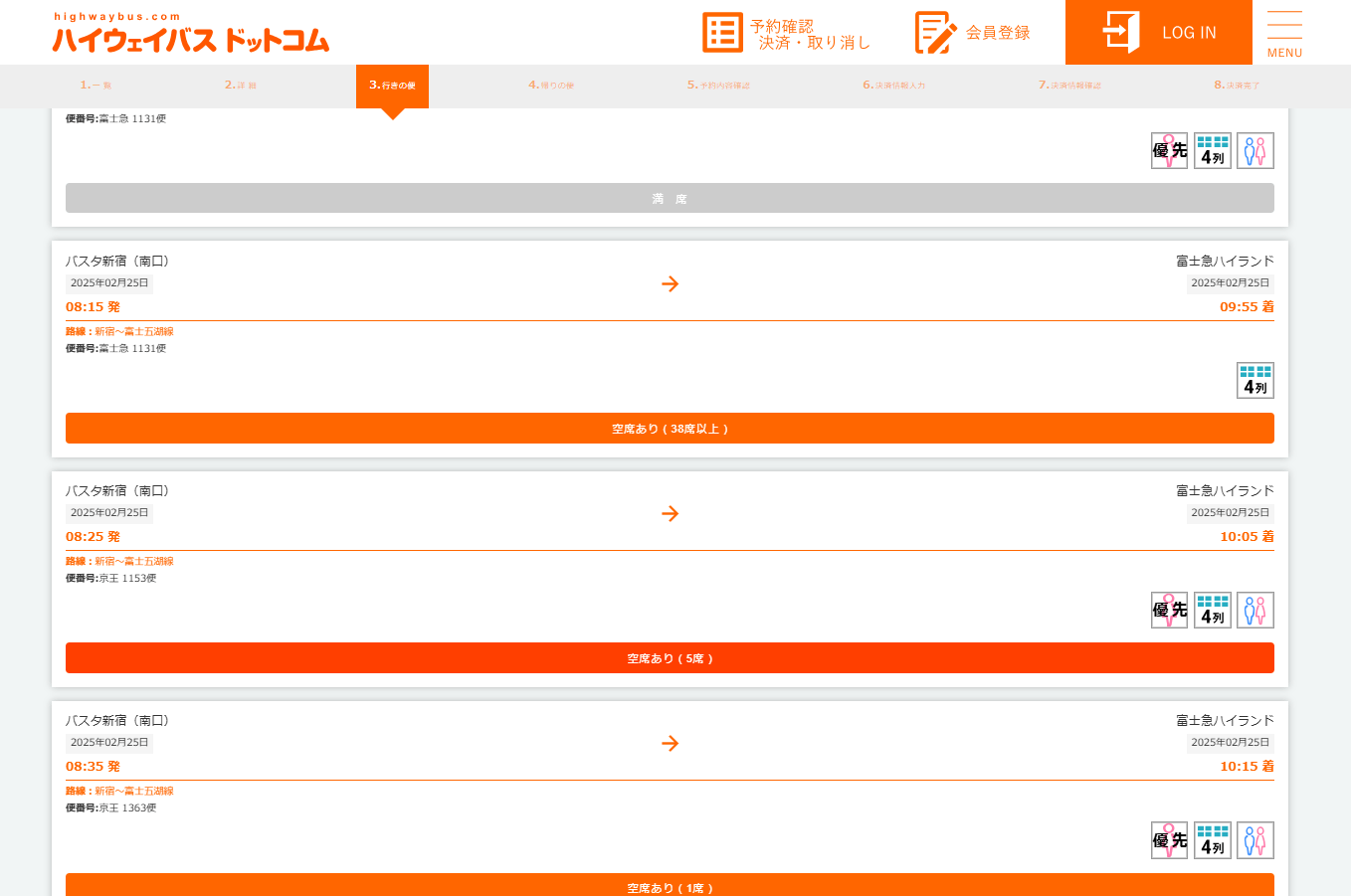 希望の便が見つかったら、「空席あり」ボタンをクリックして進みます!