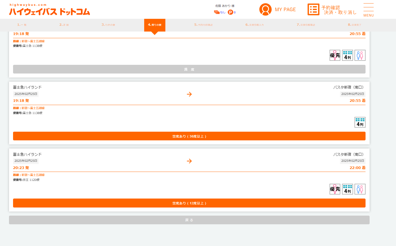 続いて、帰りのバスを選びます。