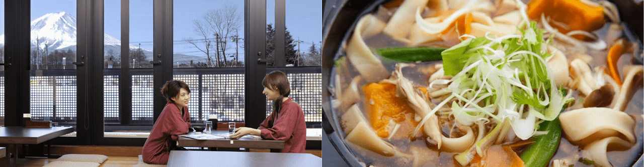 レストラン「フジヤマダイニング」で富士山を眺めながら楽しめる、こだわりの逸品 「信玄鶏と野菜のほうとう」。