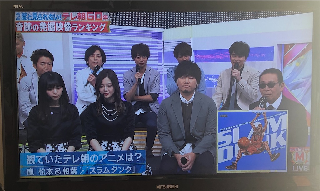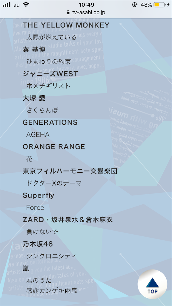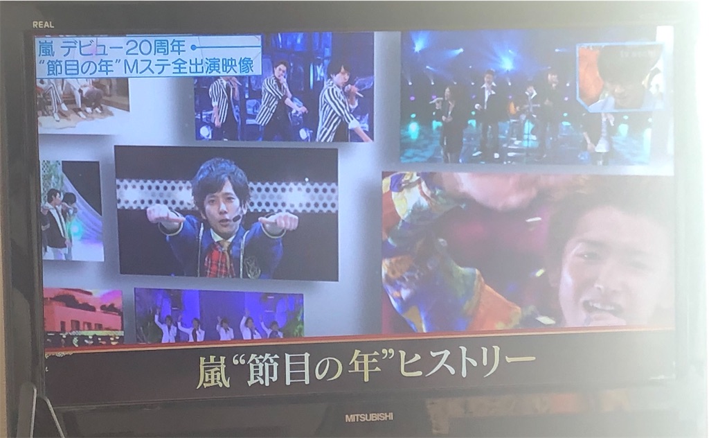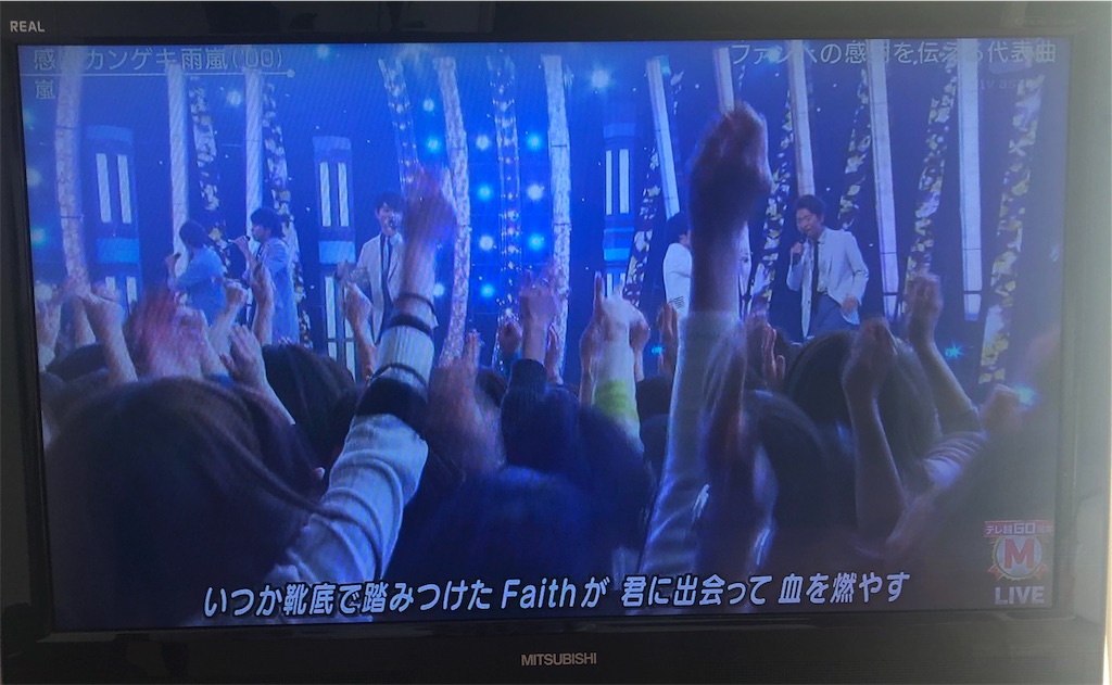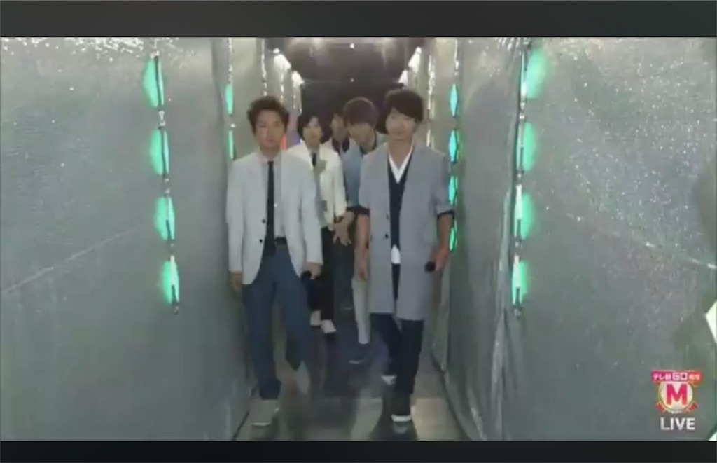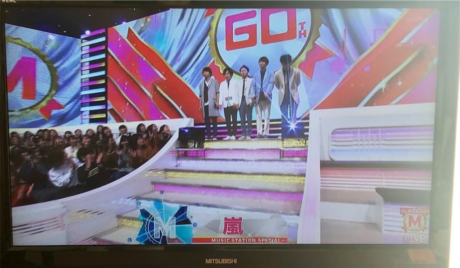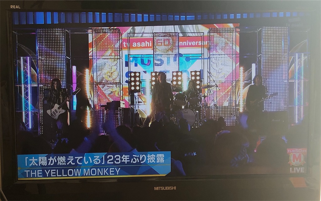 映像が変わり、イエモンからのスタート。野外アリーナからのパフォーマンス。吉井和哉さんの迫力ある歌声に圧倒され、スタジオの嵐メンバーもモニターを見ながらリズムに乗っていました。特に二宮和也くんが楽しそうにエアドラムをしていた姿が印象的だったな。VTR中、皆さん下を向いてると思いますが、ミニターはそれぞれの列の足元で1列につき3個くらい。