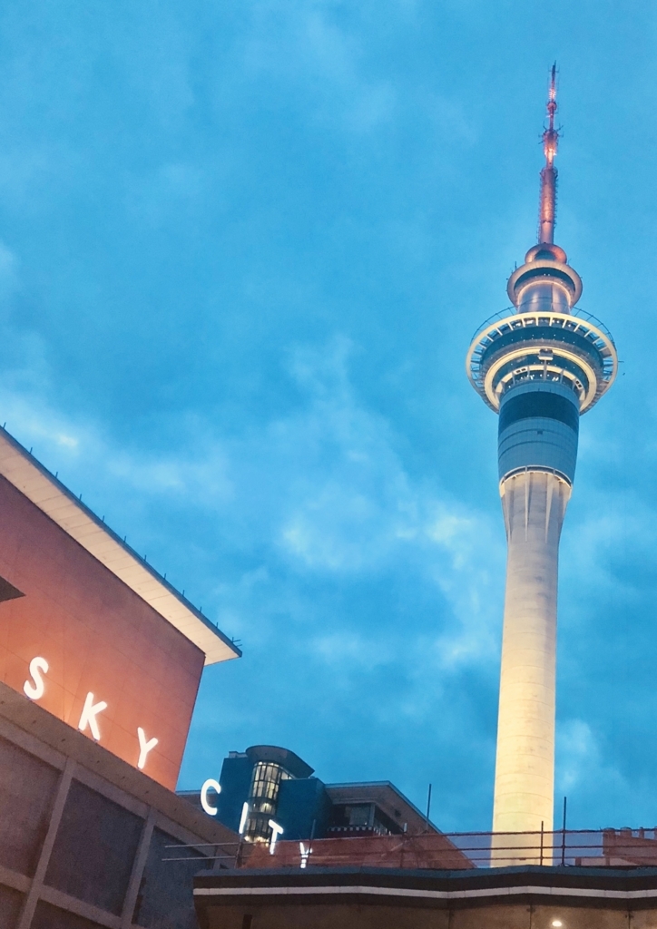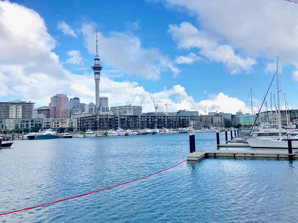港町の風景と、街のシンボルでもあるスカイタワー(Sky Tower)!その下にはスカイシティ(Sky City)という商業施設があり、東京で言うとスカイツリーのような存在です。