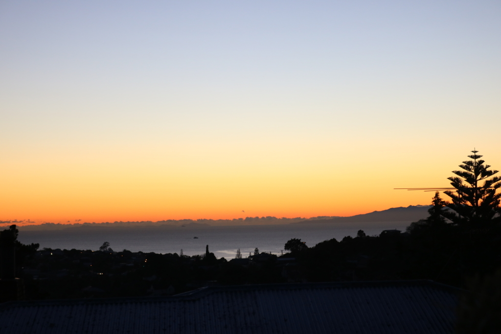 翌朝、部屋の窓から見えた景色は息をのむほど美しく、Browns Bay(ブラウンズベイ)の海と、その向こうに昇る朝日がまぶしく輝いていました。