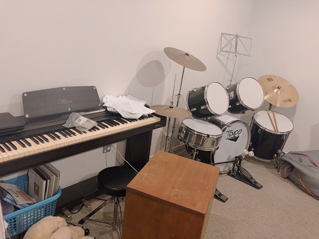 地下にはドラムやギター、ウクレレまで揃っていて、まるで自宅スタジオのよう。