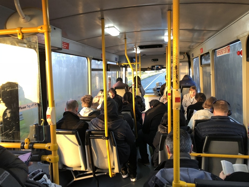 朝のバスはいつも満員で、立ったまま揺られることもしばしば。