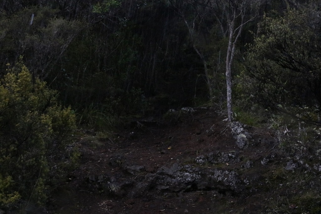 リボンやマークを頼りに何とか引き返そうとしましたが、方向感覚が失われ、雨と雹が降り始め、足場も最悪。