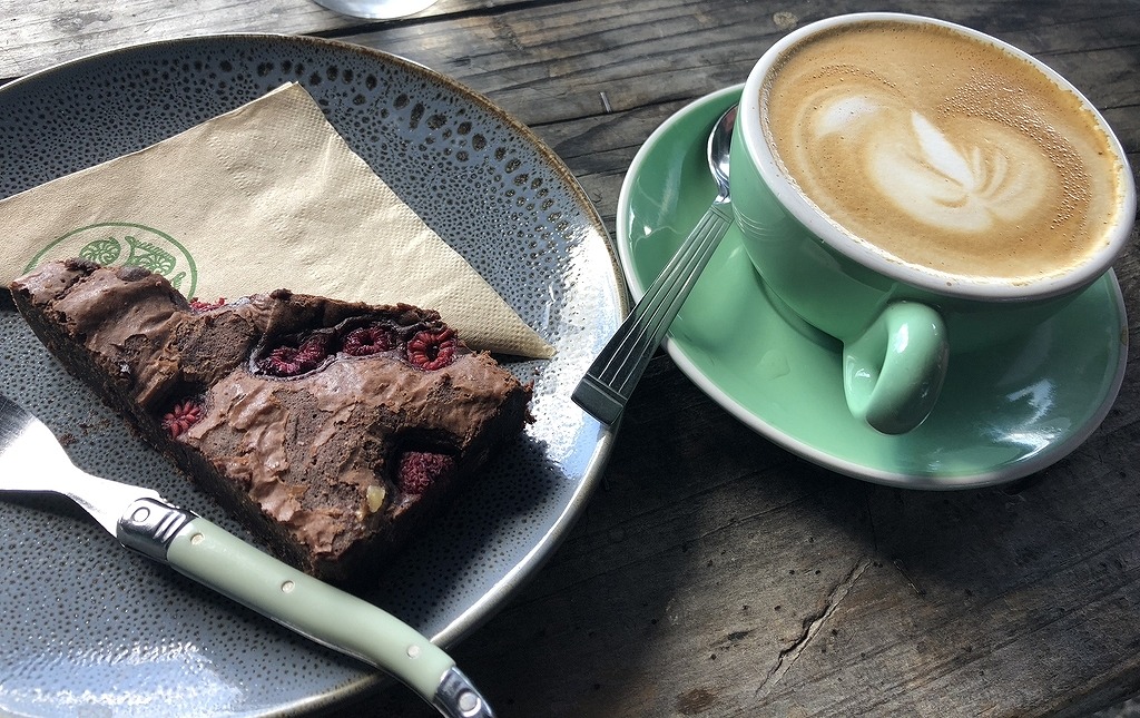 注文したのはフラットホワイトとラズベリーブラウニー。