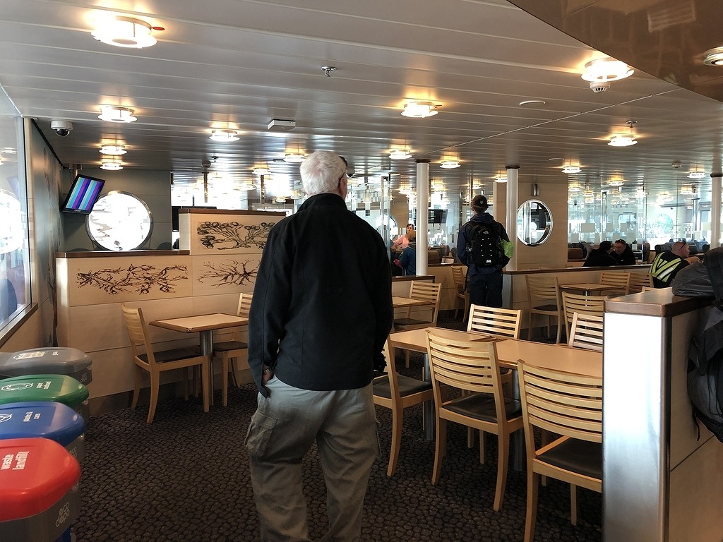 出航までの時間は、併設カフェでコーヒーを飲んだり、外のベンチで海を眺めたりしながらゆったり過ごせます。