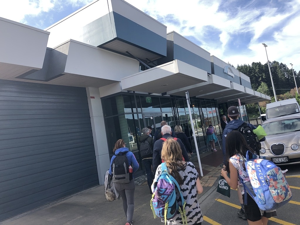 Bluebridge到着後、「スーツケースどこで受け取るの!?」と焦っていたら、スタッフが「荷物を預けた人はこのバスに乗ってください」と案内。