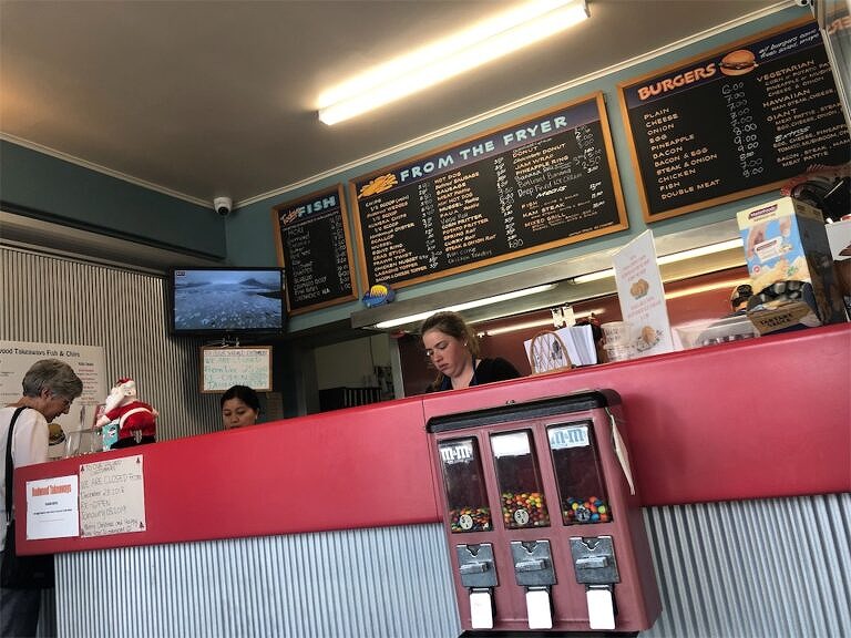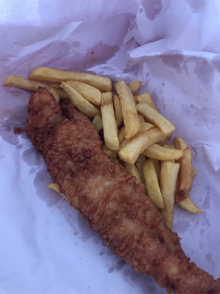 HOKIのフィッシュとチップスで約7ドル。安くて美味しくて、労働後のご褒美にぴったり。