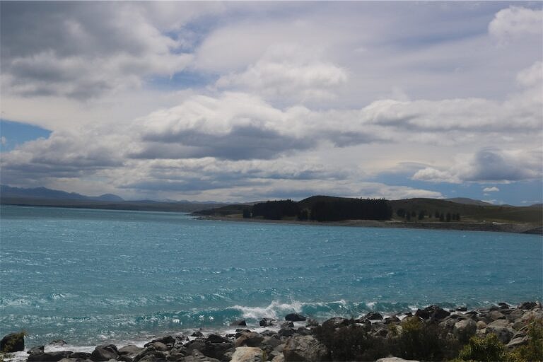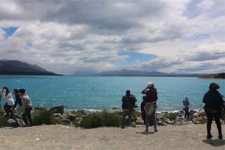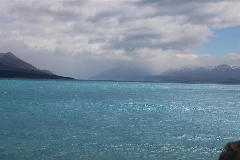 残念ながらマウントクックは見えず……それでも、ダークブルーとミルキーブルーが混ざり合う湖面は息を呑む美しさ。