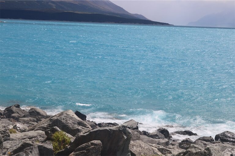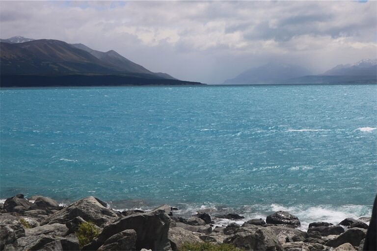 プカキ湖(Lake Pukaki) ― 曇り空でも美しい青。
