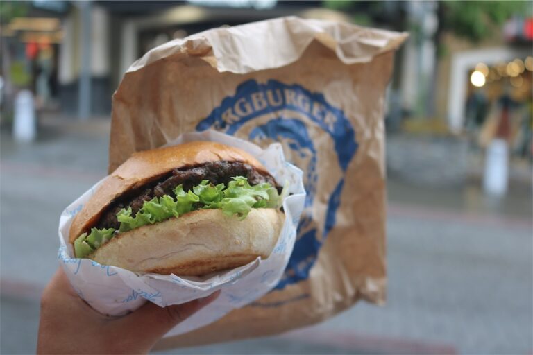 レジで注文してから約15分、ようやく手にしたバーガーは──肉がジューシーで、野菜はフレッシュ、ボリューム満点。