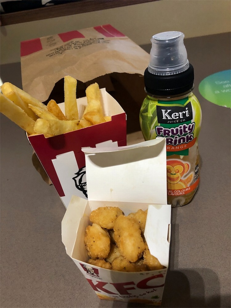 小さな紙袋に詰まったチキンとポテトが、この旅の最後をやさしく締めくくってくれました。