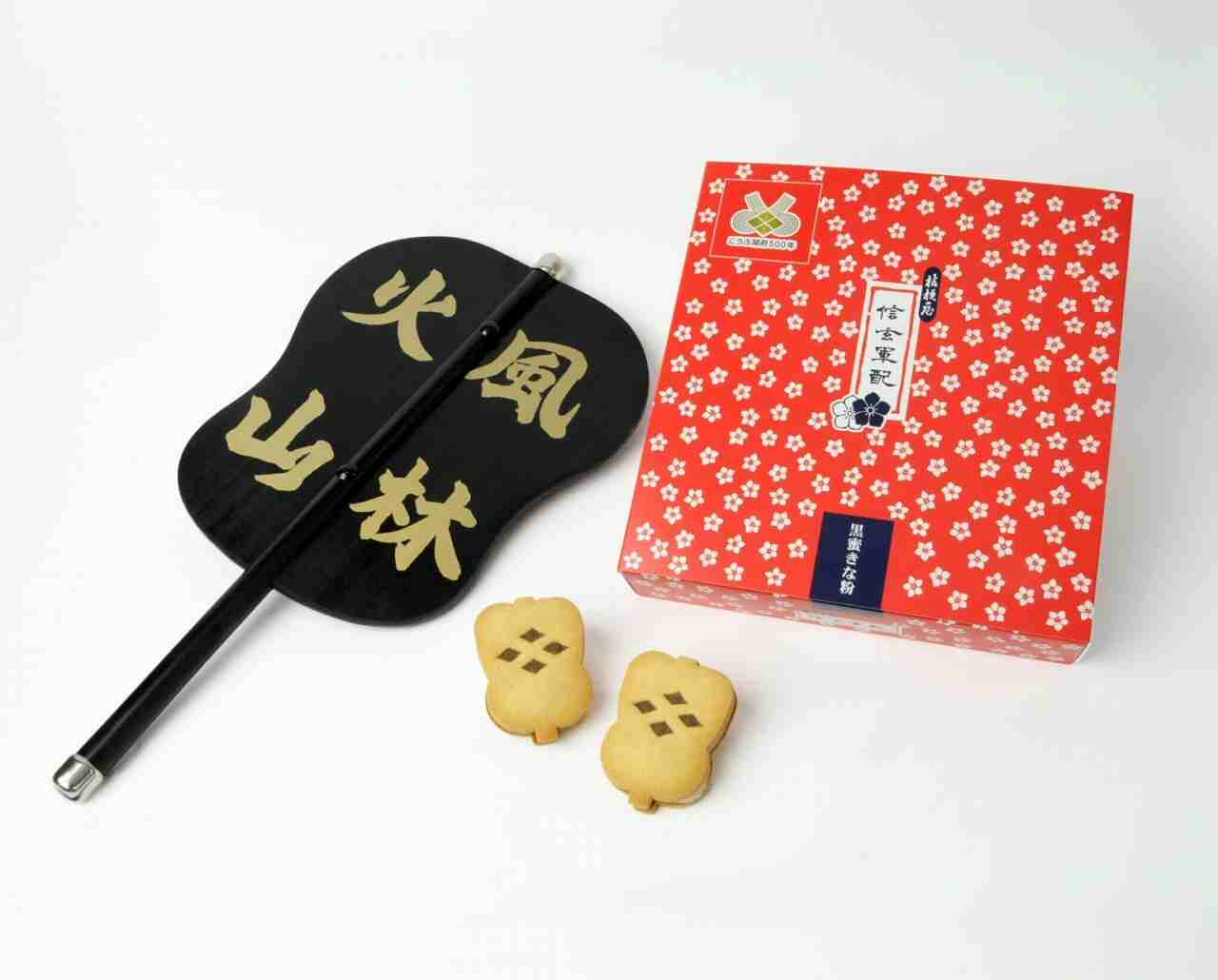 きな粉を練り込んだ軍配の形をしたしっとりとしたサブレに、桔梗信玄餅でお馴染みの黒蜜を使ったマシュマロが挟まれています。