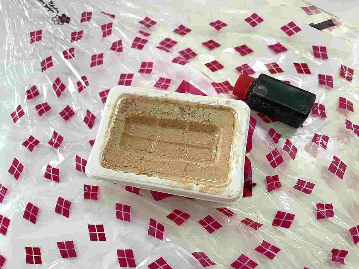 1.風呂敷を開き、容器を逆さまにして、お餅ときな粉を風呂敷に出す