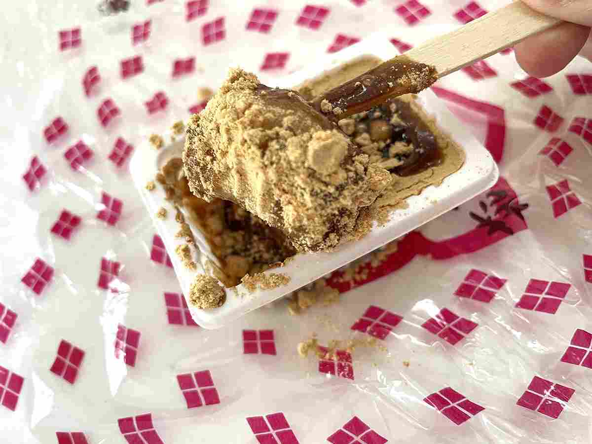 桔梗信玄餅でおなじみの黒蜜入り餡でお餅が包まれ、きな粉も口の中にふわっと広がります。