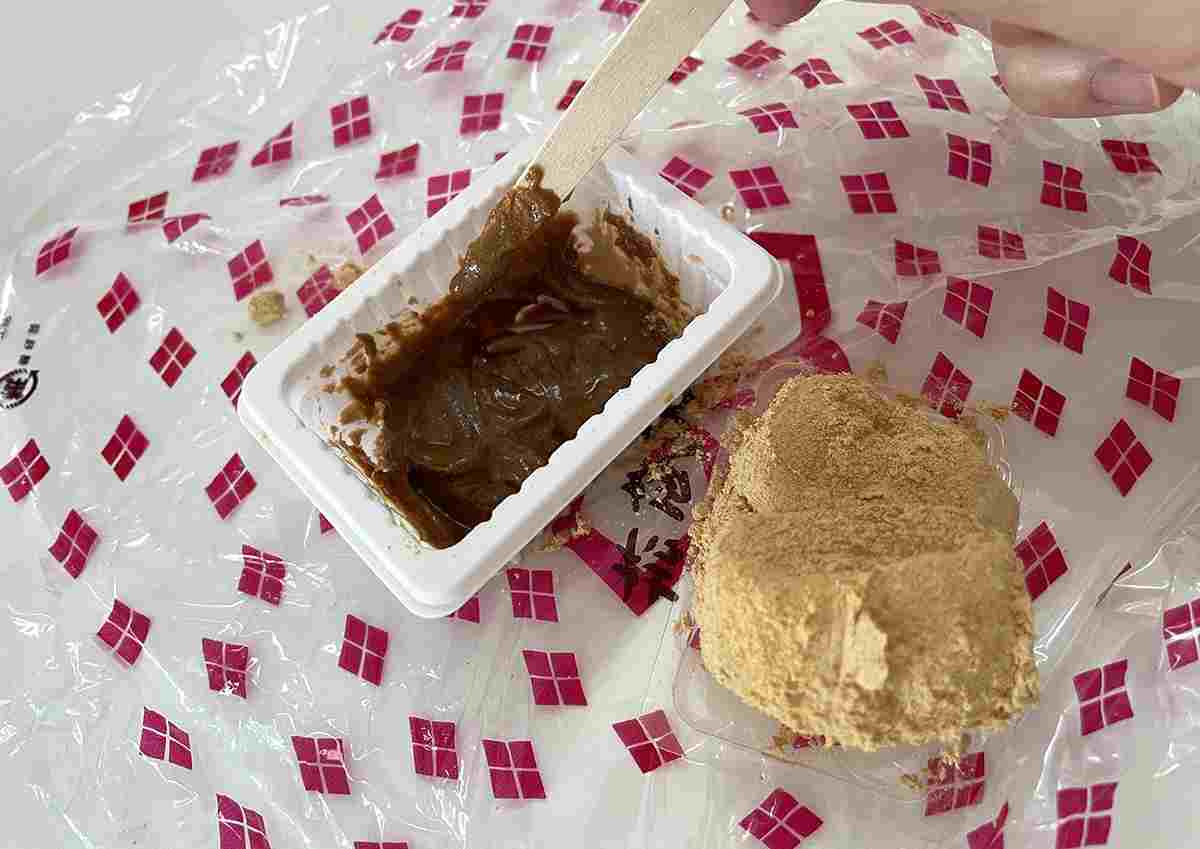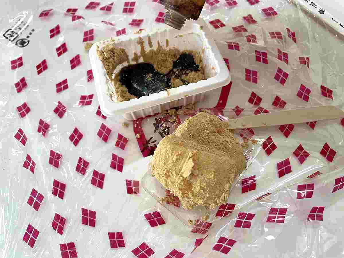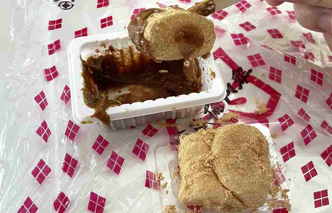 ②きな粉がくぼみになっている部分に黒蜜をかけ、お餅をディップして食べるorお餅に直接黒蜜をつけて食べる(黒蜜の濃厚な甘さを楽しめます)