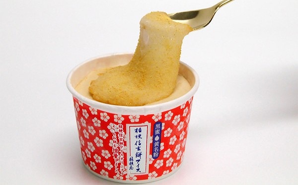 きな粉ベースのアイスクリームに黒蜜とお餅が入っており、ひんやりと冷たい桔梗信玄餅を味わえますよ!