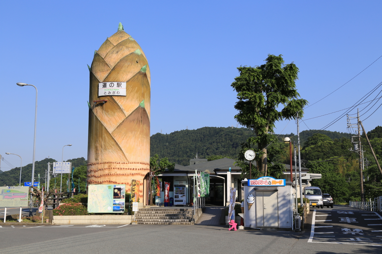 山梨県で最初にできた道の駅で、特産品のタケノコがモニュメントになっています。