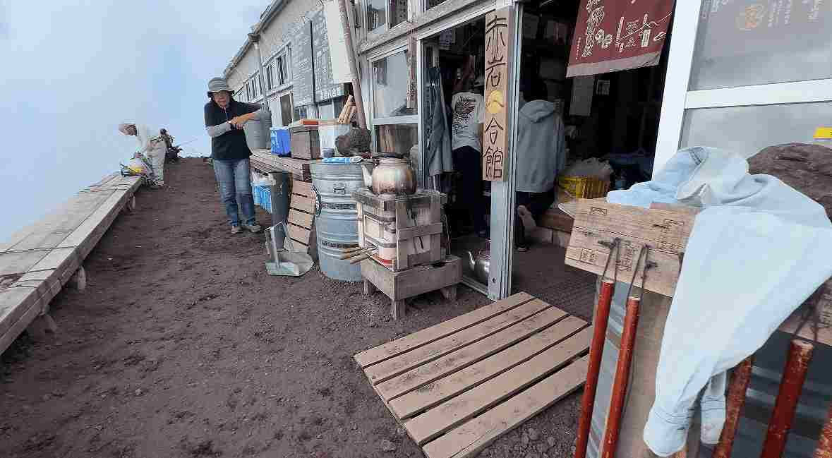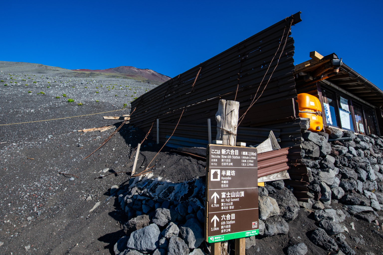 ジグザグの登山道を進むと、やがて宝永山と並ぶ標高位置にある、新六合目の半蔵坊へ。暑さをしのげる貴重な休憩スポットとして、多くの登山者に利用されています。