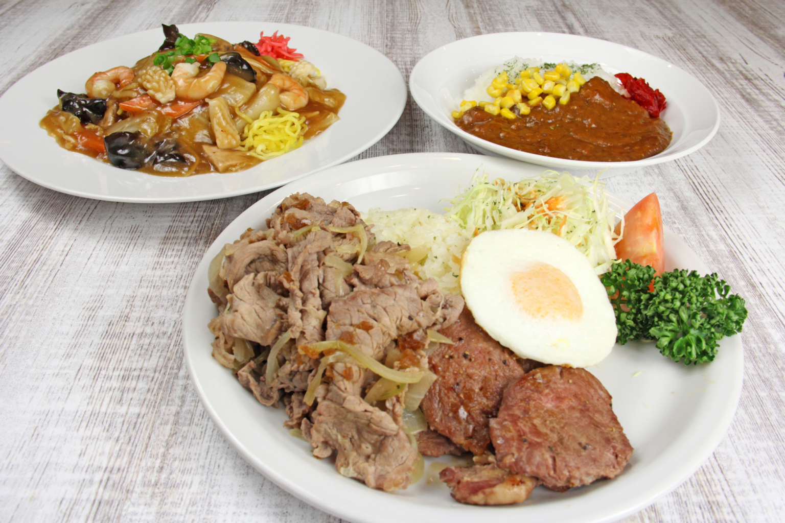 「牛焼肉とカットステーキのパワープレート」、「中華あんかけ焼きそば」、「ビーフバーガー」など、ボリューミーなメニューが多いレストラン!