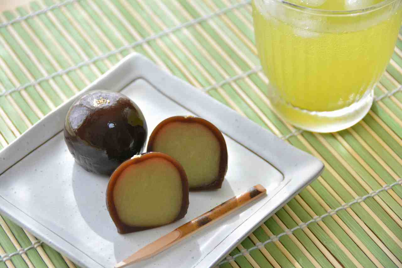 青えんどう豆で作る鮮やかな緑色のうぐいす餡を丸め、黒糖羊羹で包んだお菓子です。
