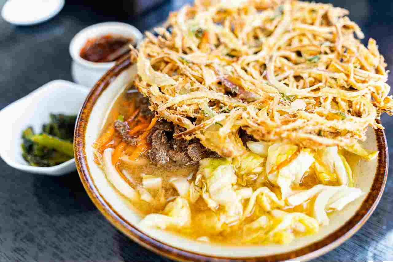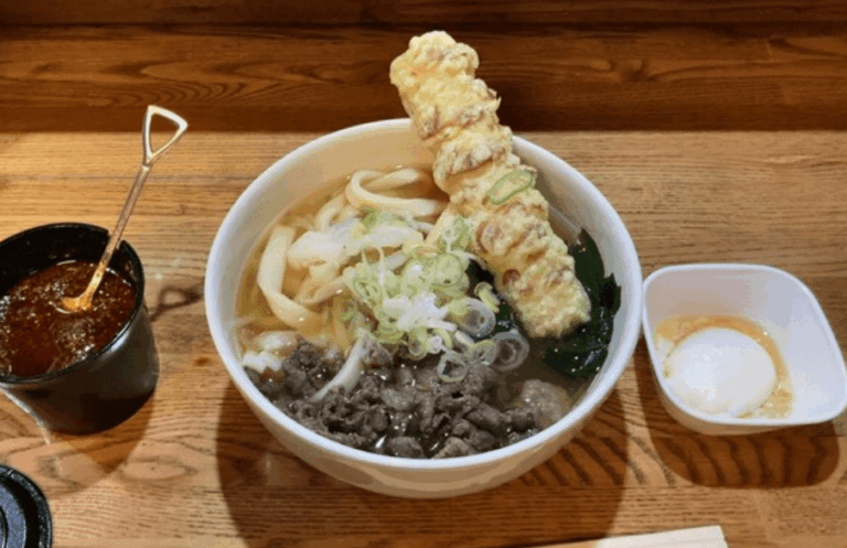 看板メニューの「肉天うどん」は、甘辛く煮込んだ牛肉やサクサクの天ぷら、きんぴら、キャベツなど具材がたっぷりで、味噌と醤油をブレンドした香り豊かな出汁が食欲をそそります。