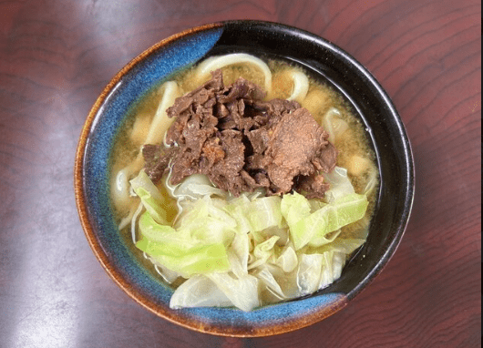 吉田のうどんならではの硬めの麺に、醤油と味噌を合わせた風味豊かなスープに、キャベツや人参などの地元野菜がしっかりと入った、食べ応えのある一杯です。