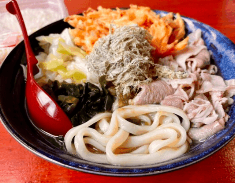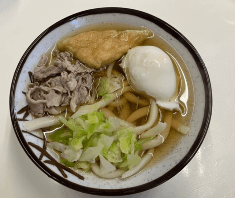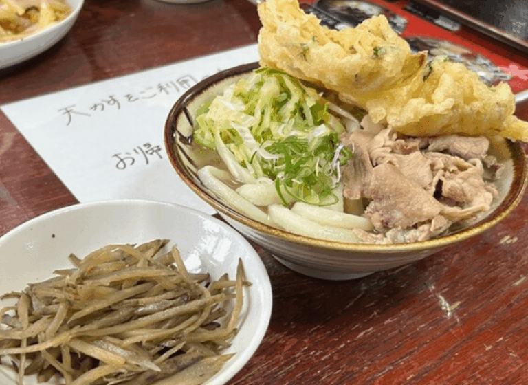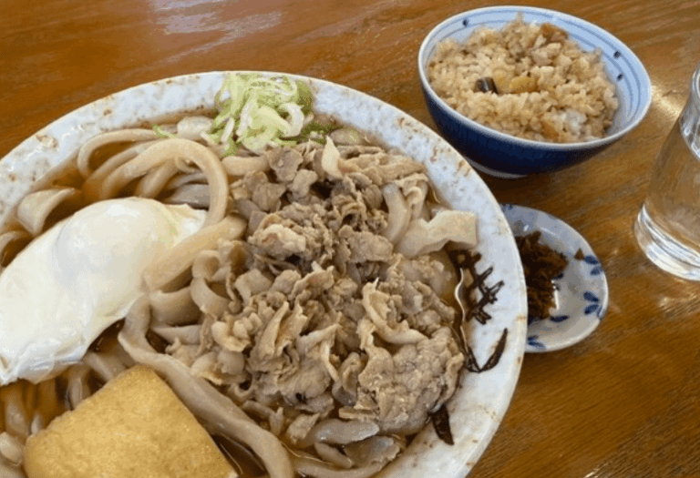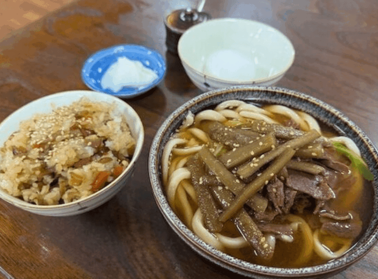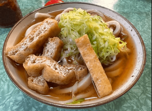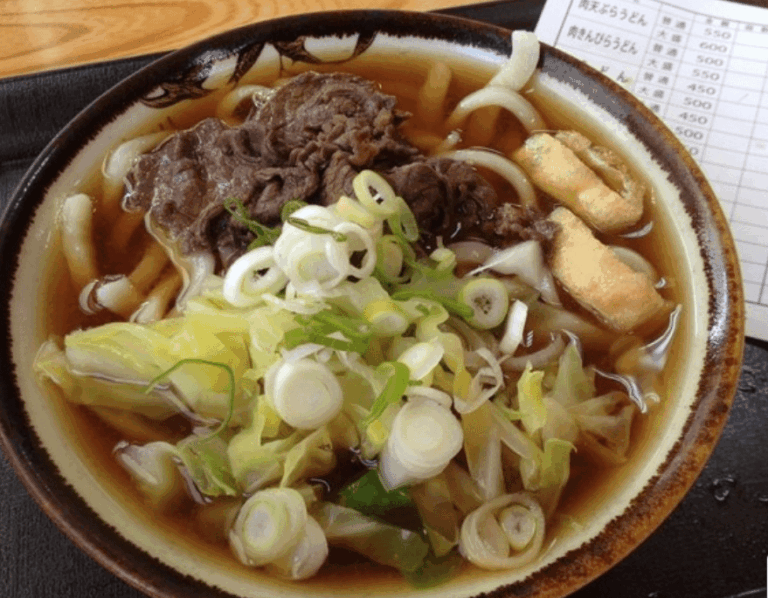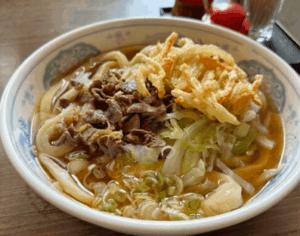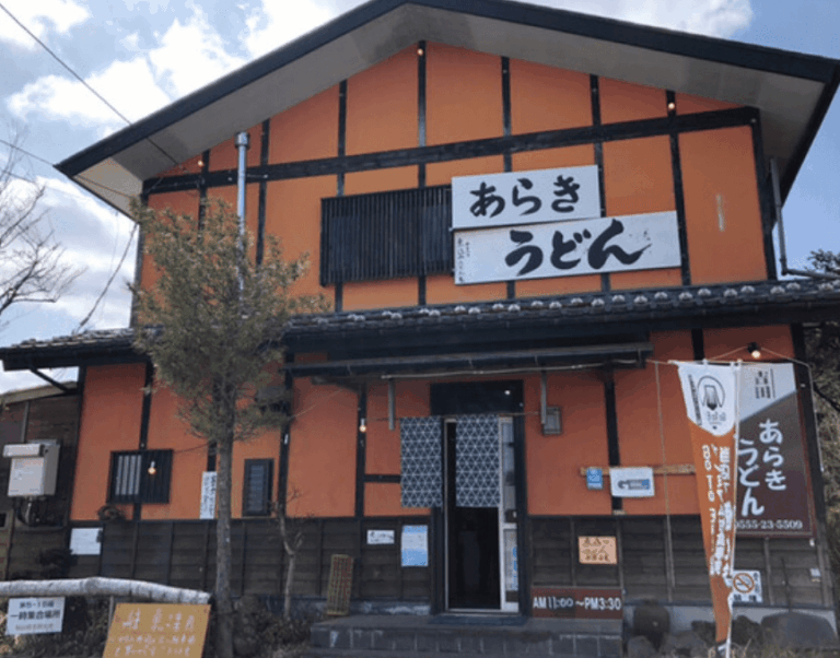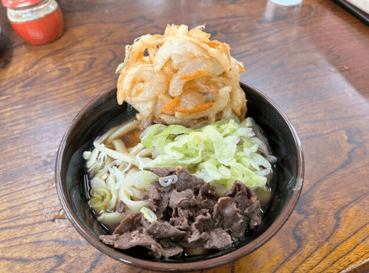看板メニューの「あらきうどん」はボリューム満点で、地元の方や観光客からも大人気!もちもちとした食感のうどんとあっさり醤油出汁の組み合わせが抜群です。