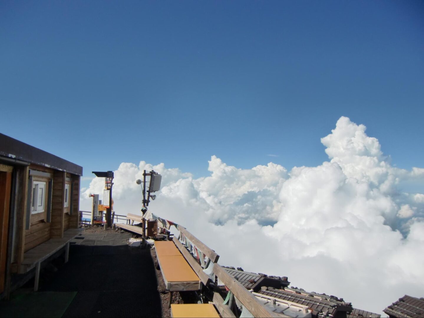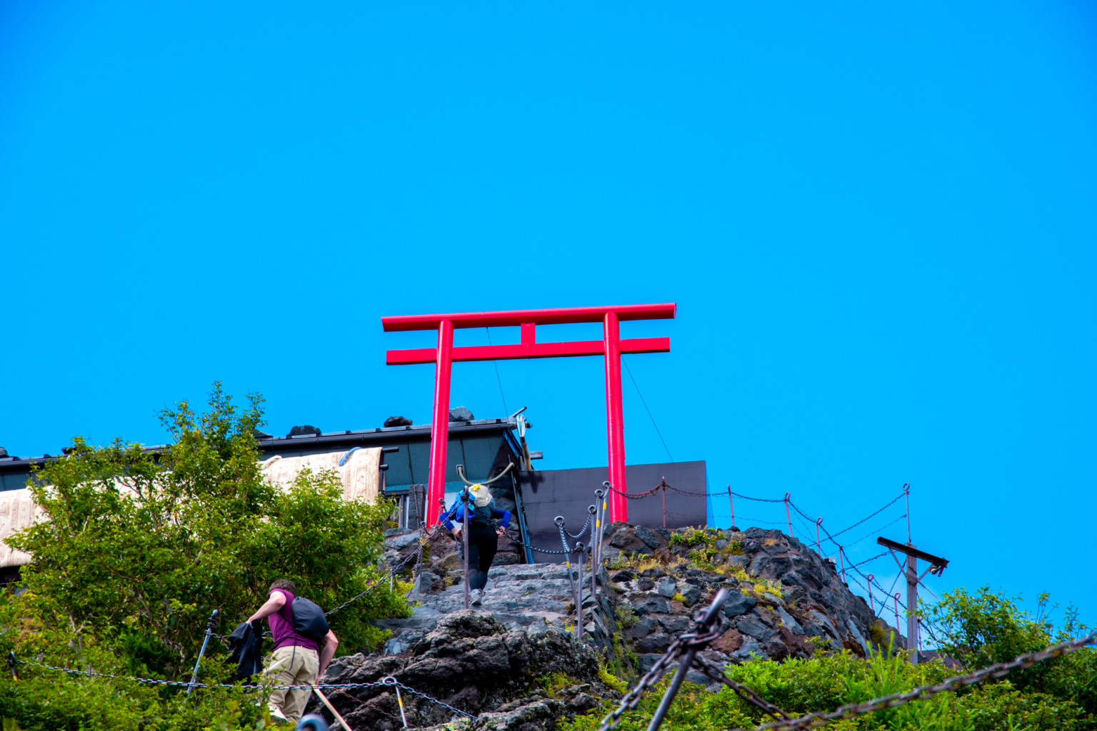 傾斜がきつくなるジグザグ道から露岩の急登に変わり、御来光館、そして九合五勺を経て鳥居をくぐると、ついに山頂・久須志神社前に到着!