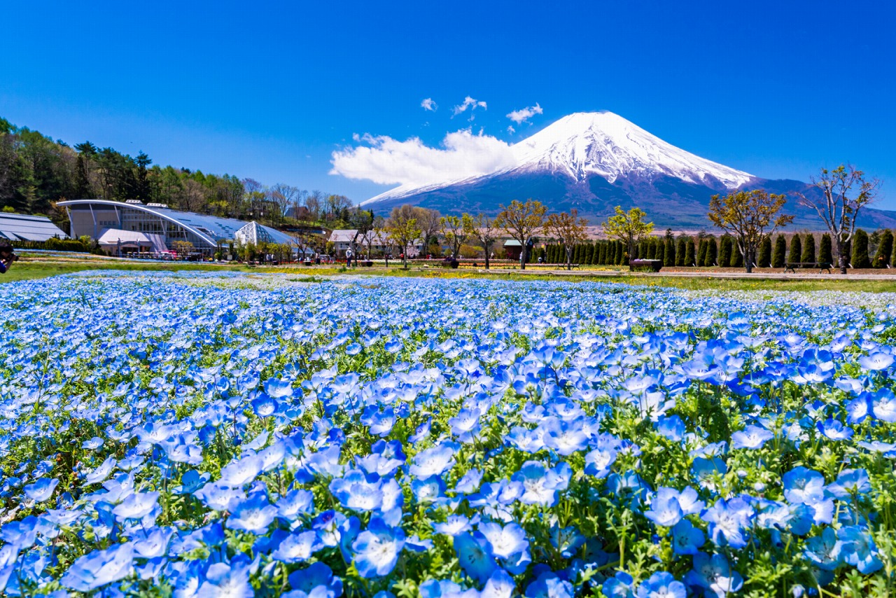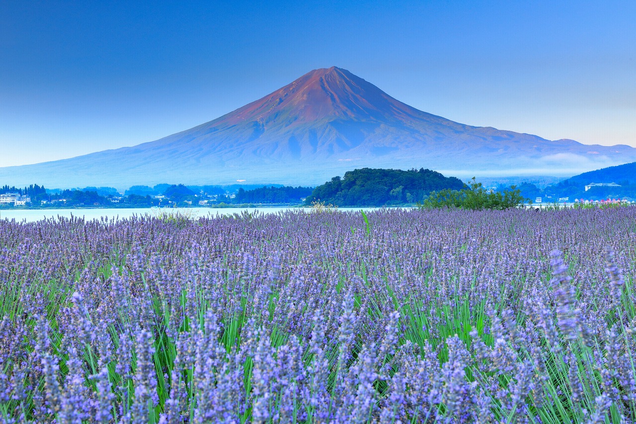 -富士山を正面に望む定番のフォトスポット。春はチューリップ、夏はラベンダーが咲き誇り、四季ごとに違う表情の富士山を楽しめます。