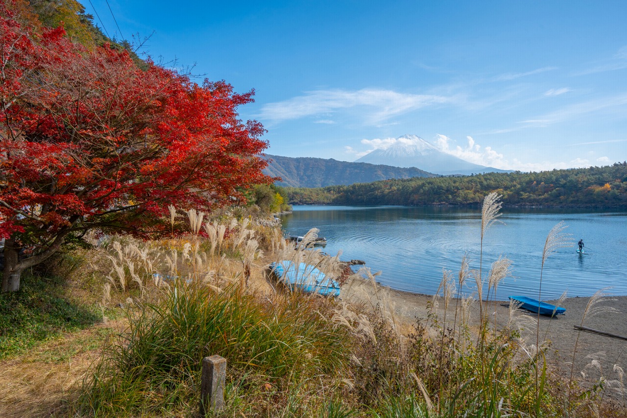 湖畔沿いの道はサイクリングやドライブにも最適で、四季折々の景色とともに富士山の絶景を間近で体感できるルートが多数あります。