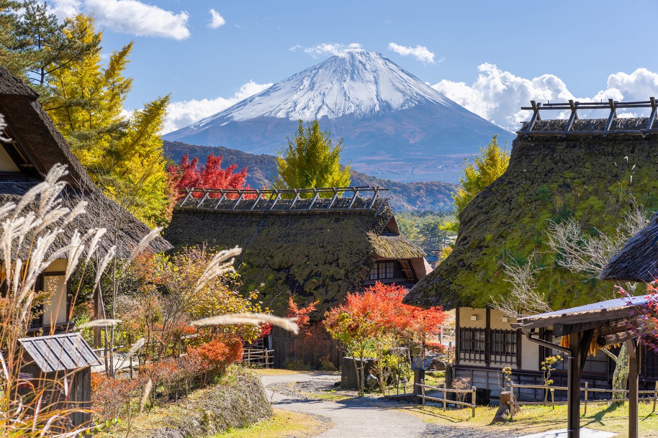 富士山を背景に茅葺き屋根の家々が立ち並ぶ人気観光地。昔懐かしい日本の原風景の中で、食事や工芸体験、地場産品のショッピングが楽しめます。