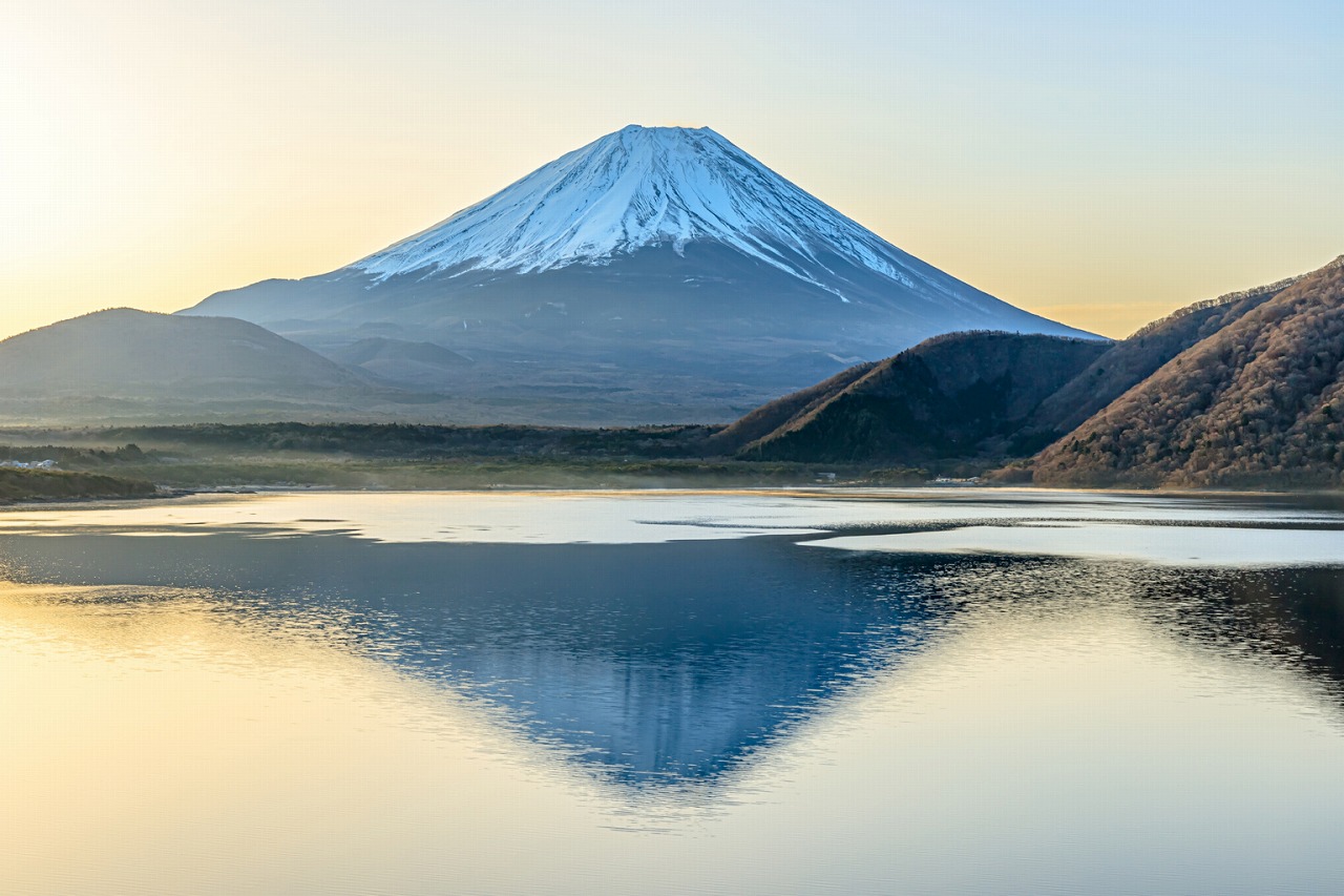 湖面に映る富士山が幻想的に輝き、1日の始まりを彩ります。